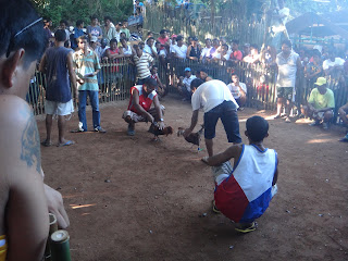 Entre deux tours de magie avec la petite China, fille d'une des employee du Lodge qui semble nous avoir adopter, nous avons pu assister au traditionnel combat de coqs du dimanche. Sorte de mega tournoi ou l'honneur du dresseur est en jeux et ou les sommes pariees sont halluciantes et un peu floues car tout le monde hurle de tous les cotes. Evidemment pas de touristes en vue! Le bookmaker a tente d'expliquer un peu le principe a Noemie qui pensait arreter de manger du poulet a vie suite au premier combat particulierement sanglant. C'etait sympa et buccolique!