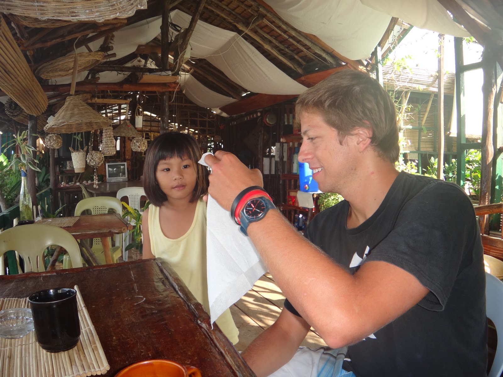 Nous avons aussi fait des theses en buvant l'apero avec Scott (ancien marine US vivant de sa rente et du commerce de sa femme), Thomas un divemaster et un Suisse-Allemand vivant aux Philippines depuis 20ans. On a eu droit a tous les ragots et anecdotes du coin dont l'expliquation des pannes d'electricite de Coron, un sketch!