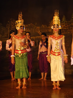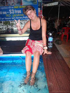 Nous avons aussi decouvert les joies du massage Khmer (sympa) et du massage aux poissons (hilarant). Nous avons pu assister a un spectacle de danse traditionnel, l'Apsara. Tres beau! Nous sommes egalement en possession d'un nouvel ami, "Mr Bouddah" (bouddha en bois d'un kilo) rencontre au detour d'un temple et qui a fait fondre notre coeur!!! Malheureusement notre ami n'a pas le droit de voyager par colis postal car celui-ci risque d'etre confisque en Thailande... Du coup on l'a partout avec nous dans le sac (du moins jusqu'en Thailande ou il prendra le bateau pour la Suisse). Promis on vous donnera regulierement de ses nouvelles et des photos de lui en voyage... :-)