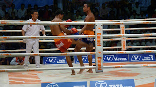 Belle experience aussi celle de la boxe cambodgienne. Notre guide-taxi nous a emmener a un tournoi enregistre par la television nationale en dehors de la ville. Pour reprendre ses termes: "C'est comme la boxe Thai mais different!" ;-) Spectacle unique se deroulant en 5 rounds de3 minutes pour les hommes et 5 rounds de 2 minutes pour les femmes. Tous les coups sont permis (ou presque). Tres impressionant et surtout marrant de vivre ca entoure de fans refaisant le combat apres chaque round. Comme quoi c'est pareil partout et pour n'importe quel sport!
