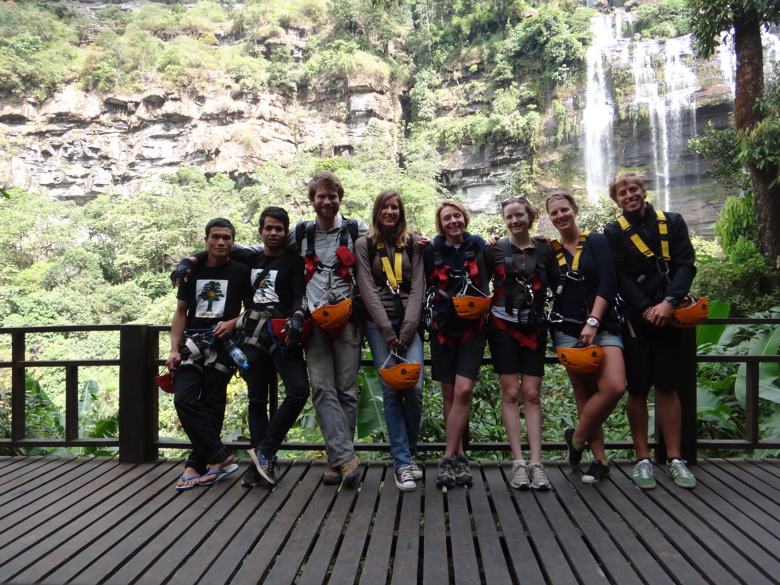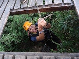 Nous avons donc sillonne la jungle a coups de tiroliennes, descentes en rappel, marches assez rudes, via ferrata,... accompagne de nouveaux amis: Anna, Linty, Krista et Alex. Ainsi que de nos supers guides: Pet, La et Sum. Des malades!!! Toi tu galeres en baskets et eux galopent en tong... Une joyeuse tribu internationnale! Il y a pas a dire "non de bleu" c'etait "bonnard"!!! (just for you girls)
